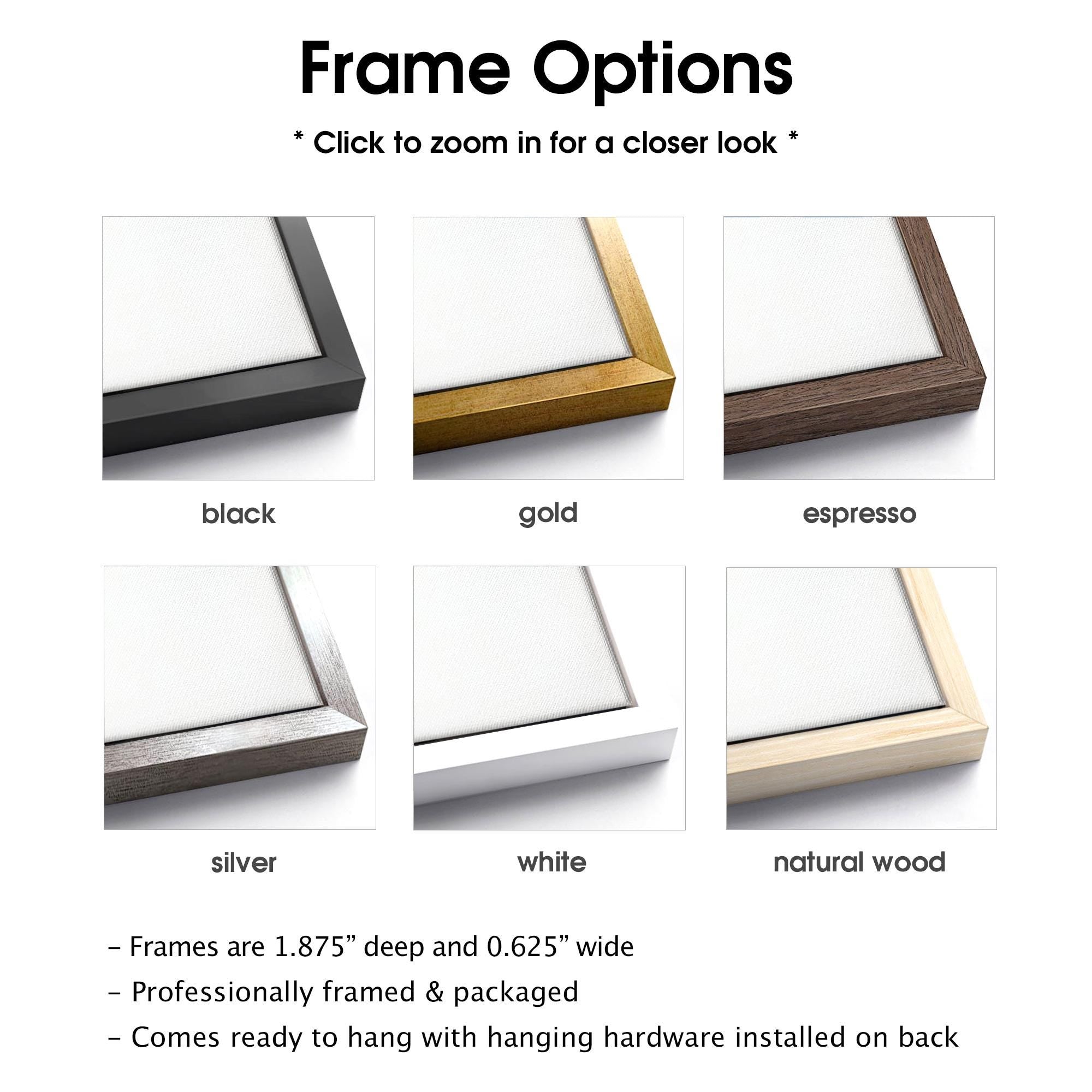 • Option to add a frame - see "Frame Options" in photos above for colors/styles available. All frames add approx 1.75" to overall width of artwork and are 2" deep.