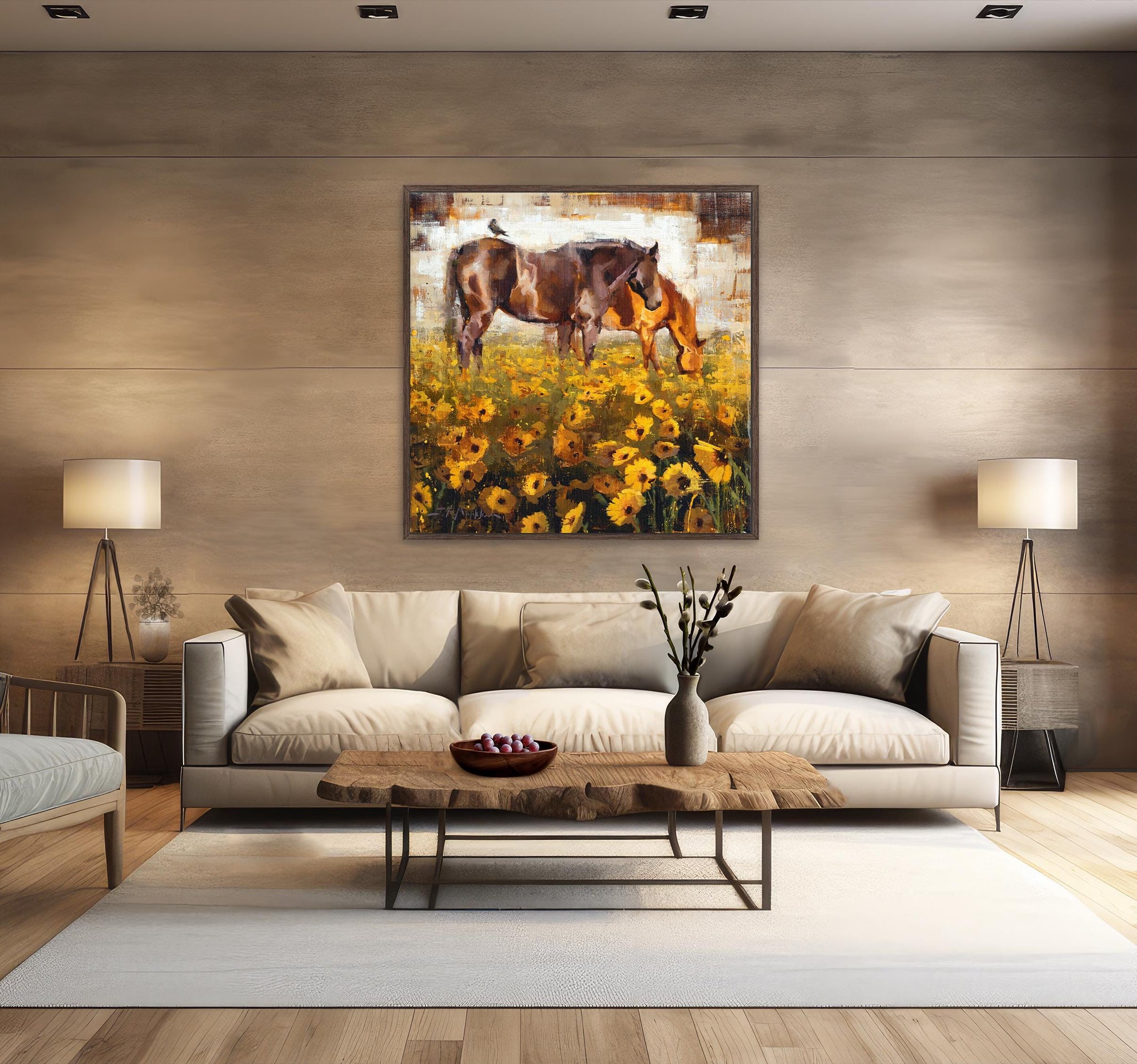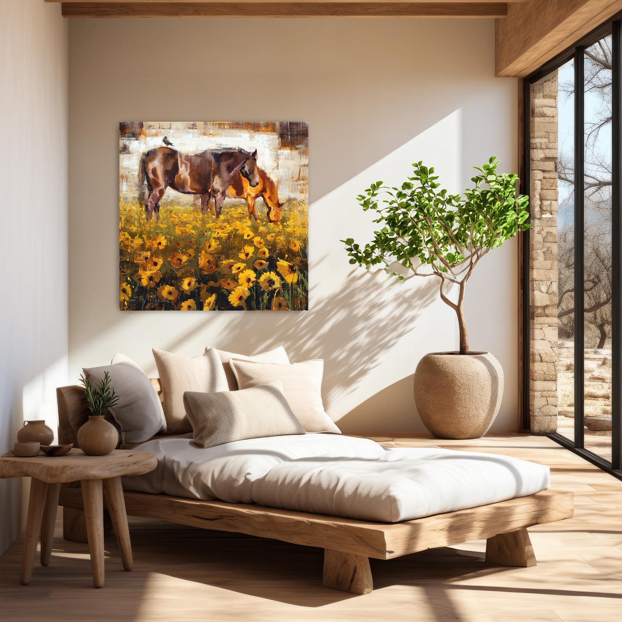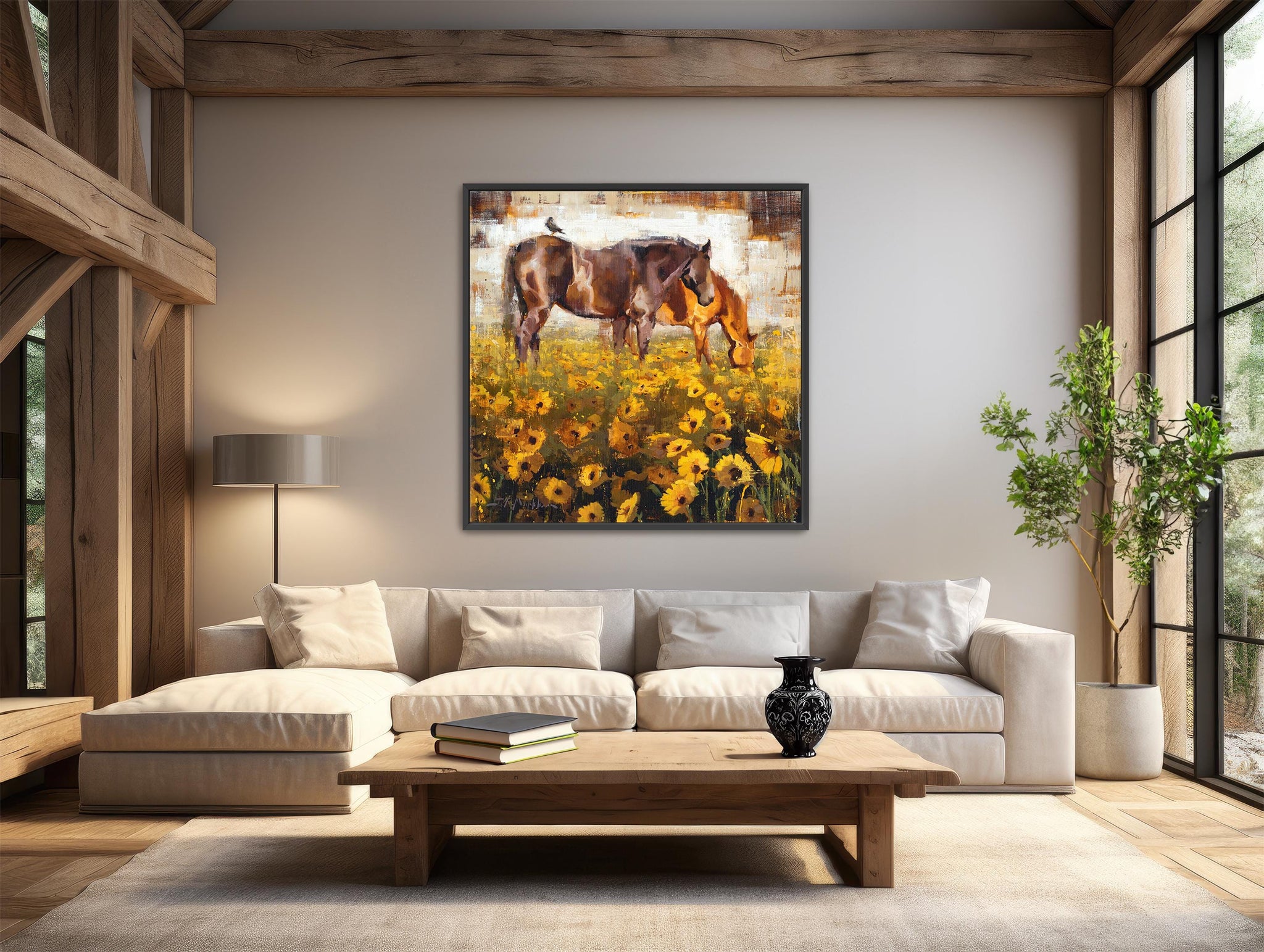 Canvas print of horses in a field of yellow flowers from the original oil painting by Jerry Markham. Original painting is sold.