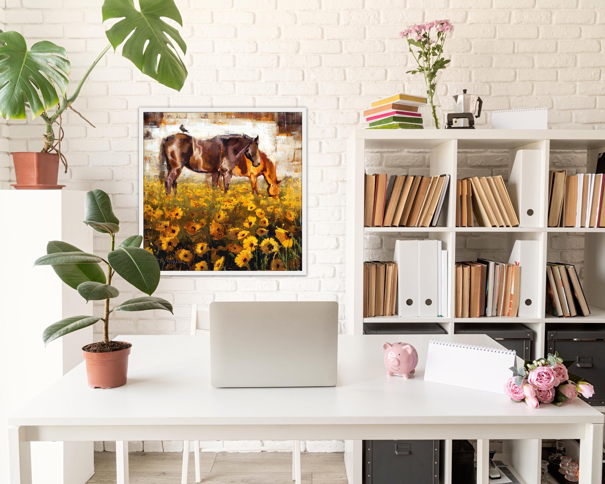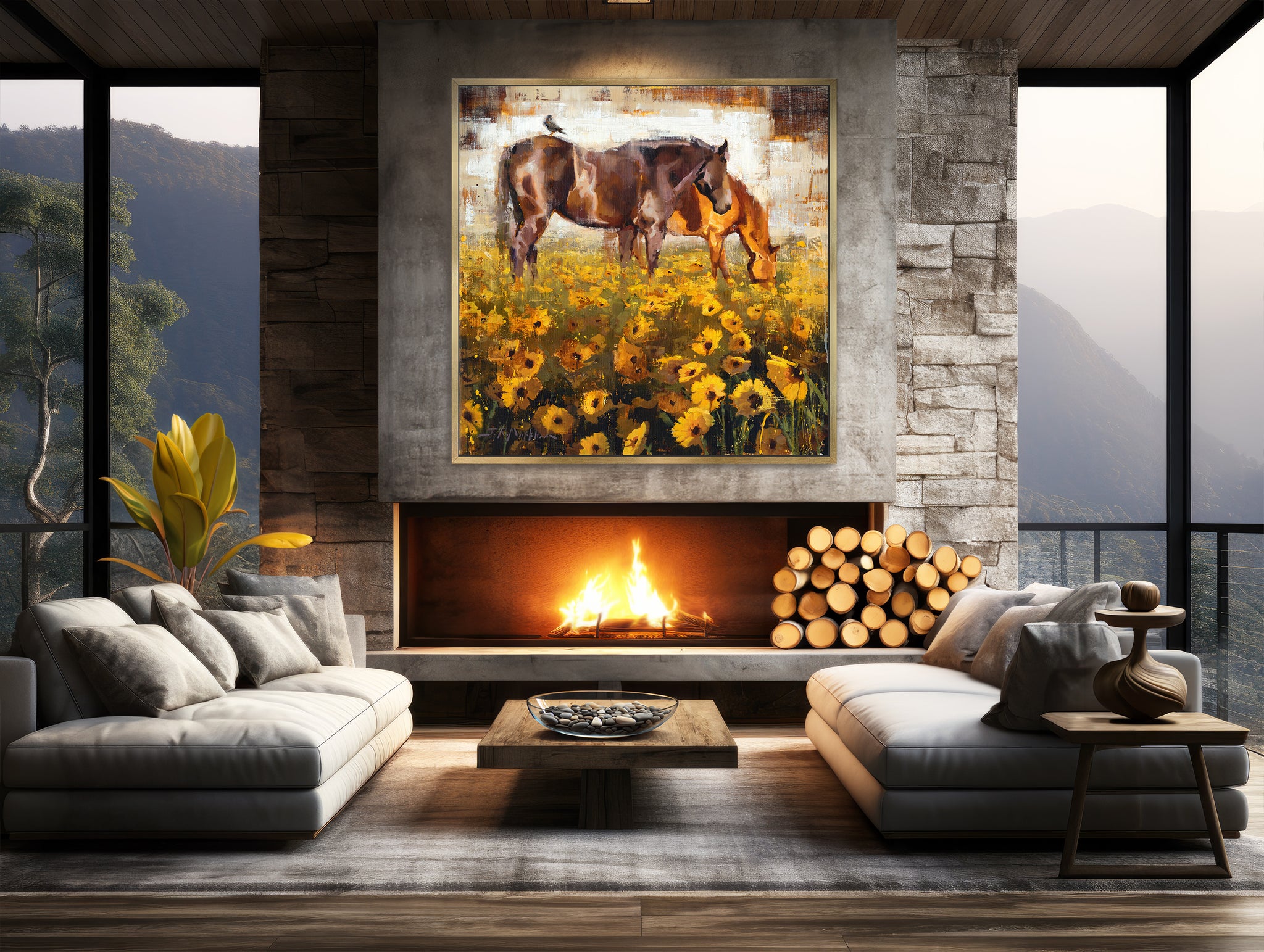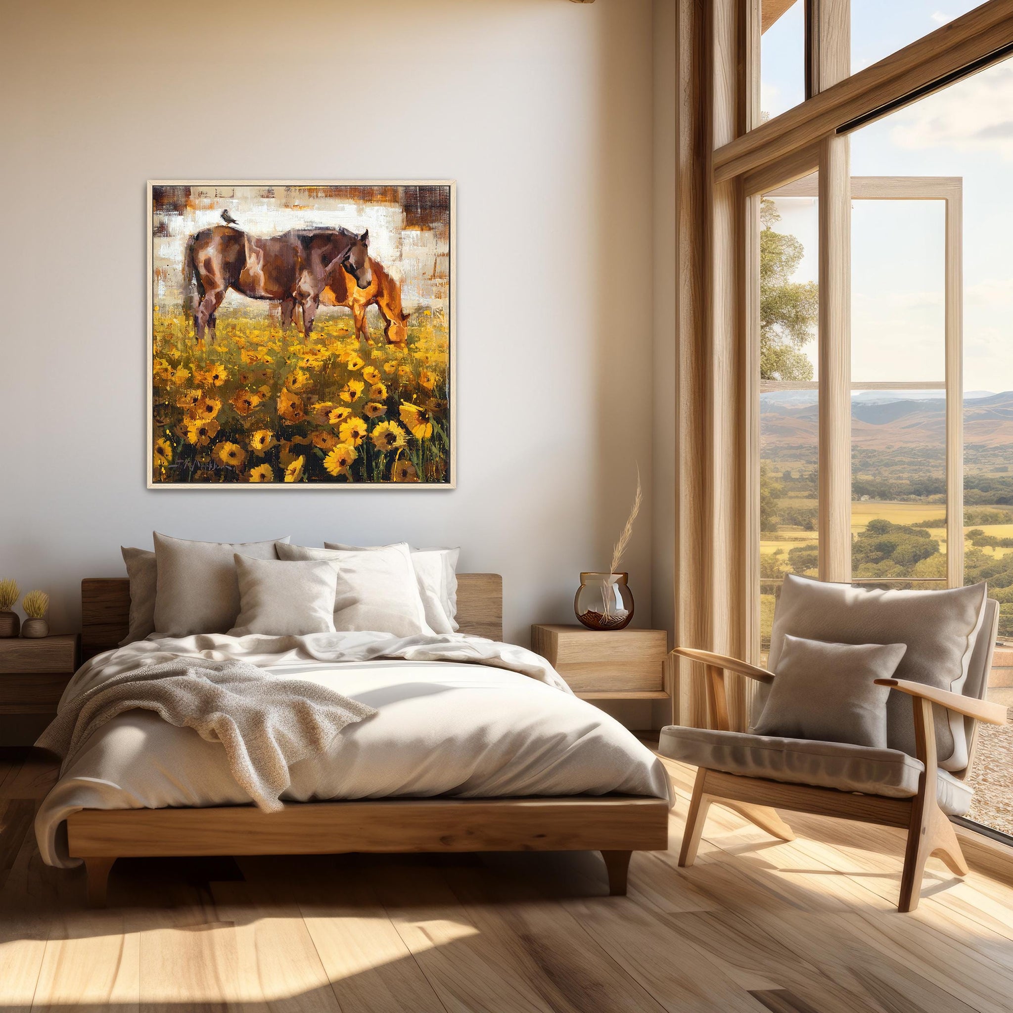 Canvas print of horses in a field of yellow flowers from the original oil painting by Jerry Markham. Original painting is sold.