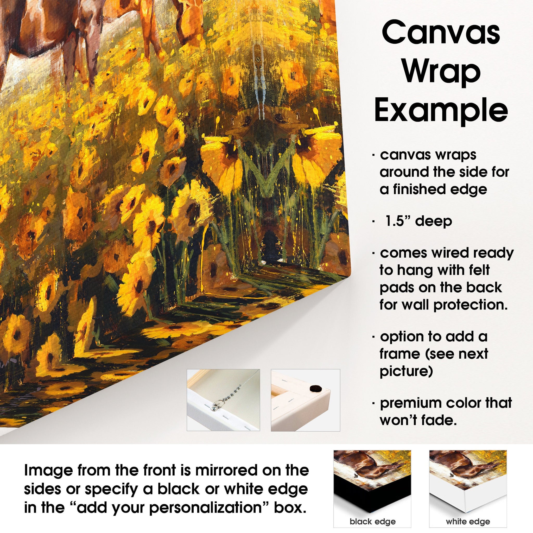 Custom made at a professional print shop using high quality gallery canvas with premium color designed to last over 100 years with no fading. Comes ready to hang with hanging hardware attached.